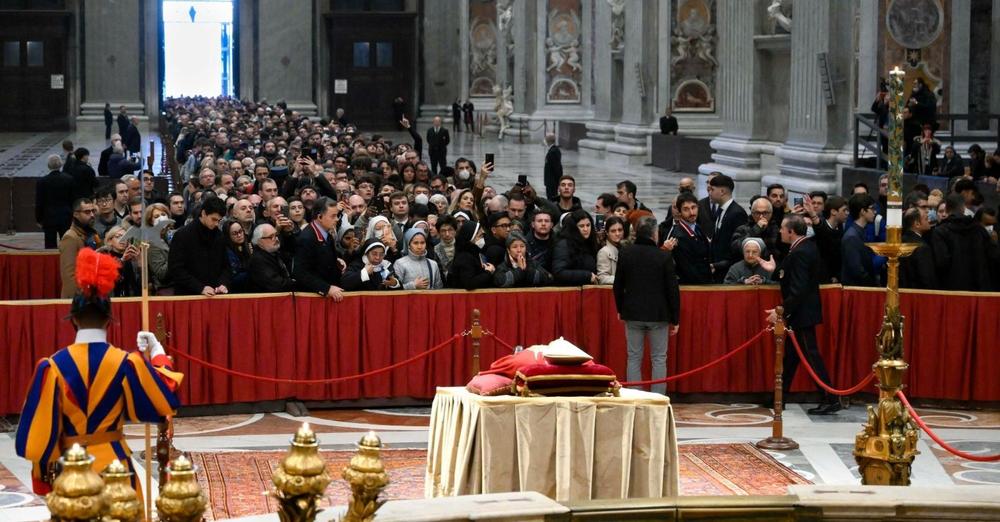 O corpo, em câmara ardente, encontra-se na Basílica desde a manhã de segunda-feira e tem sido ponto de peregrinação para pessoas de todo o mundo, que chegam a uma Praça de São Pedro sob fortes medidas de segurança, com postos para revistas e detetores de metais, numa operação que envolve forças policiais e militares.